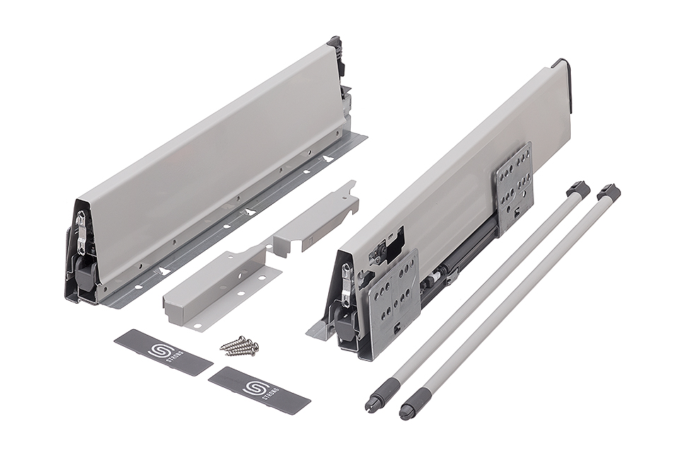 Tiroir coulissant avec amortisseur et côté creux, incluant 1 paire de relings. Longueur 450mm, hauteur 204(225mm). Capacité de charge jusqu'a 35kg. Couleur gris. Tout ce qui est nécessaire pour assembler un tiroir avant est inclus dans ce kit. Pour un tiroir intérieur, il est nécessaire de commander en supplément le panneau avant.