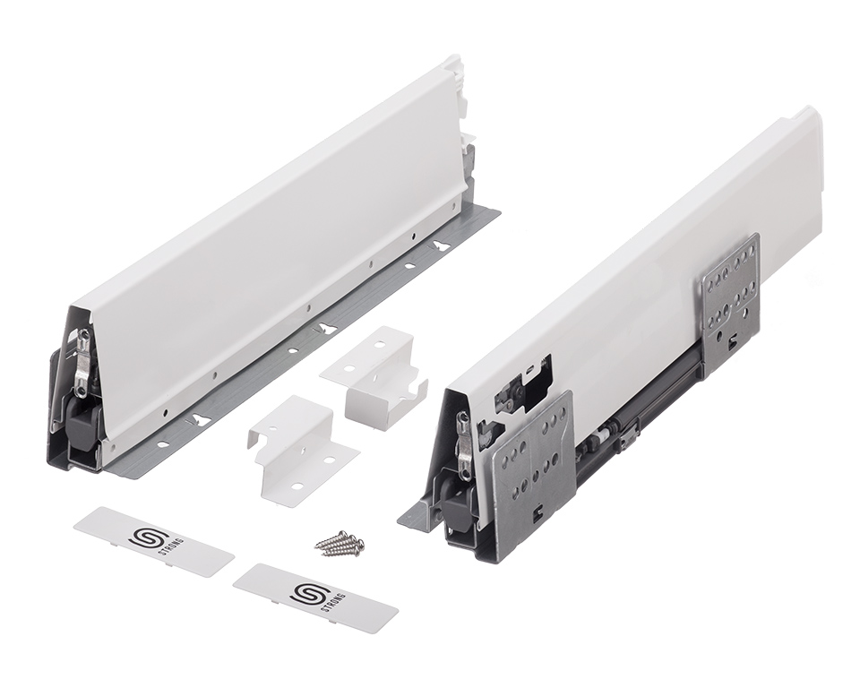 Tiroir coulissant avec amortissement et flanc creux. Longueur 300mm, hauteur 86(105mm). Capacité de charge jusqu'a 35kg. Couleur blanche. Tout le nécessaire pour monter un panneau avant de tiroir dans ce kit. Pour un tiroir intérieur, il est nécessaire de commander séparément le panneau avant et les supports.