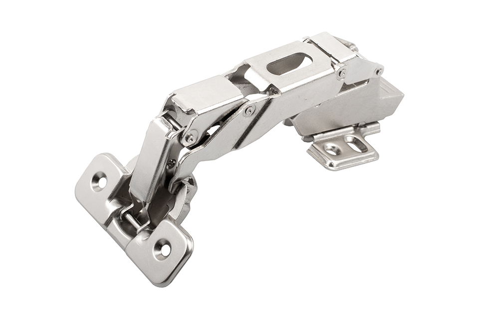 Charniere encastrée 155° sans ressort (pour ouverture sans poignée), a clipser. Réglage du jeu entre la porte et le corps de meuble par excentrique.