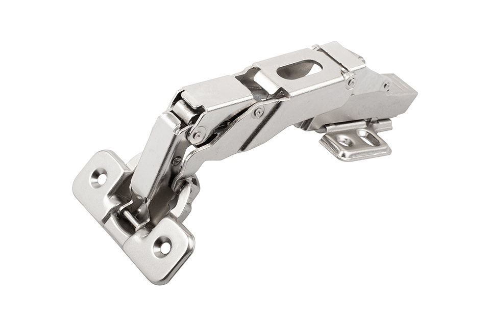 Charniere 155° semi-appliquée avec amortissement, a clipser. Réglage de l'écart entre la porte et le corps de meuble grâce a un excentrique.