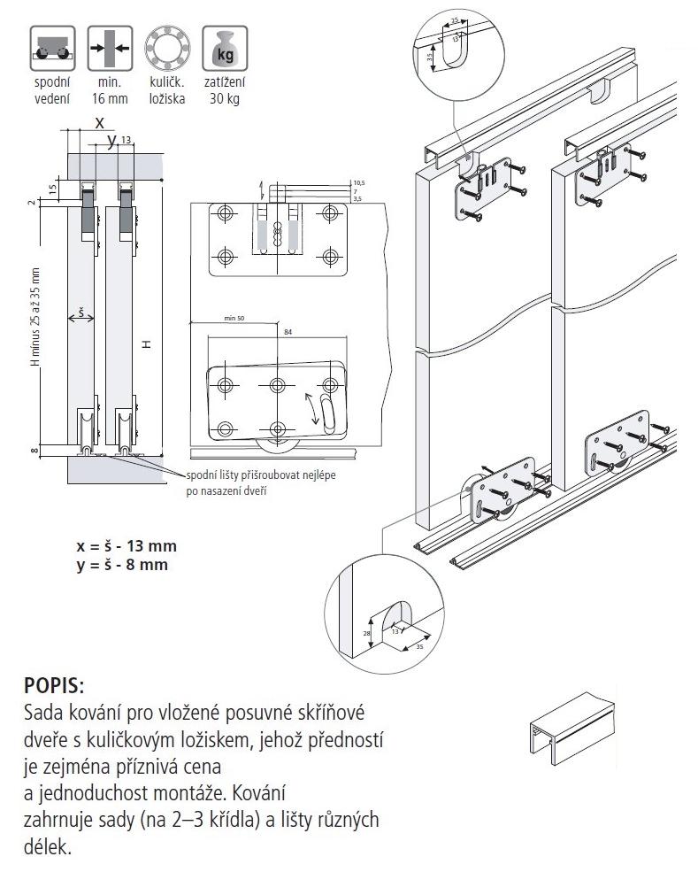 Ensemble de quincaillerie coulissante pour portes coulissantes d'armoire, capacité de charge 30 kg/porte, ensemble pour deux portes. Guidage disponible pour longueurs 1,2 m, 2 m et 3 m.