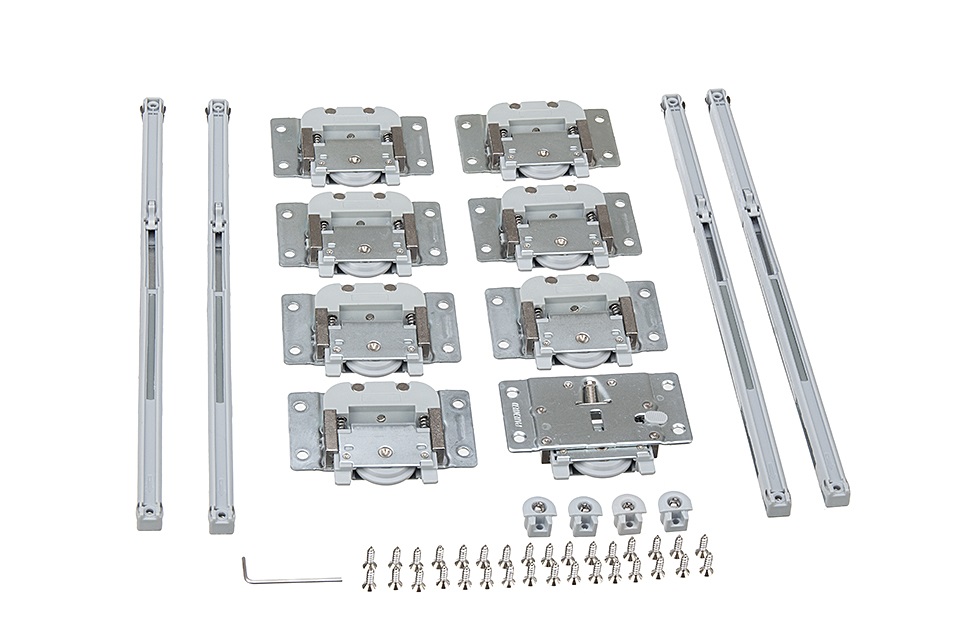 Ensemble de ferrures pour porte coulissante d'armoire, capacité de charge 40 kg/porte, ensemble pour deux portes. Disponibilité des rails en longueurs de 1,5 m, 2 m et 3 m, voir assortiment associé ci-dessous. Largeur minimale recommandée de l'ouvrant - 500 mm en respectant le rapport hauteur:largeur de 3:1. L'ensemble contient : 4x amortisseur, 8x chariot, 4x butée inférieure, 32x vis a bois, 1x clé Allen.
