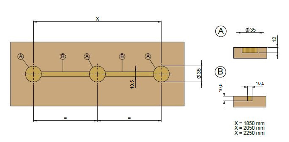 Apres avoir fraisé les rainures et réalisé les alésages pour les coupelles, raccourcissez les caches des tiges filetées, enfilez-les sur les tiges filetées et insérez-les dans les rainures. Le cache central possede un espace de dilatation de 5 mm de chaque côté. Maintenez les caches avec les clips fournis. Peut etre coupé sur toute la longueur.
