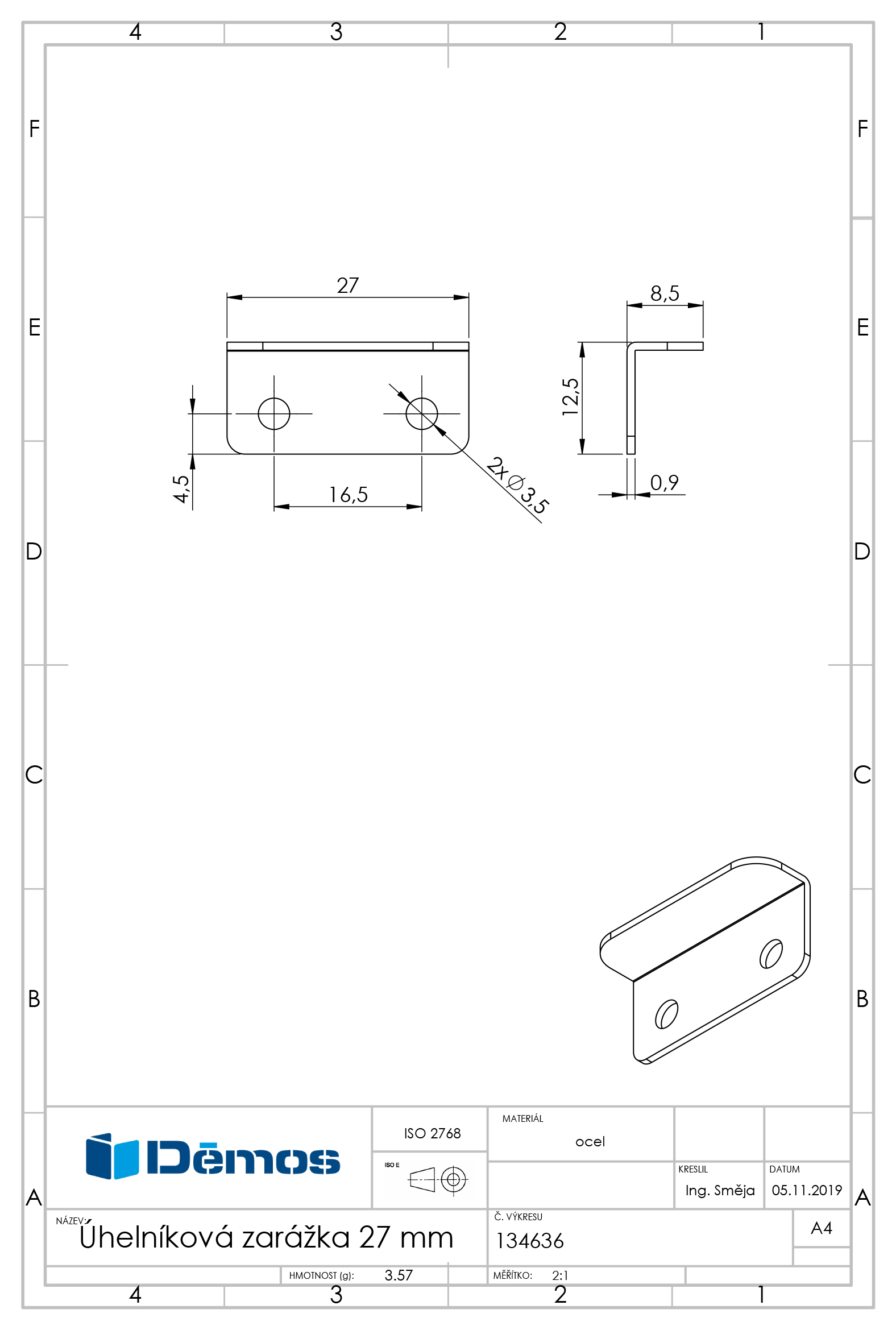 Longueur 27 mm, largeur totale 12,5 mm et hauteur 8,5 mm. Matériau épaisseur 1 mm. Espacement des trous 16,5 mm. La butée d'angle sert a sécuriser les verrous a crochet et les tiges de penes.