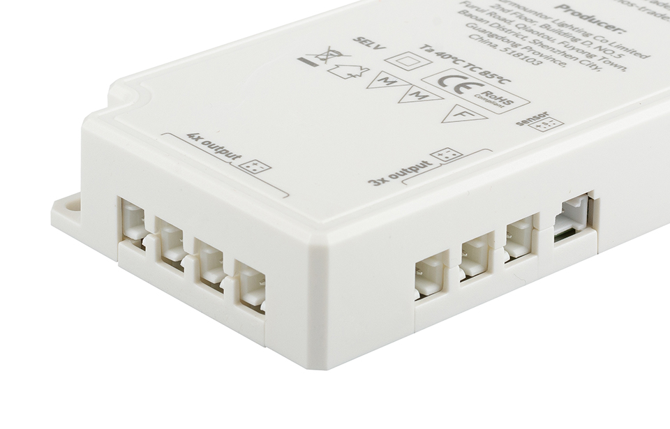 Les interrupteurs/variateurs 3PIN, voir Gamme associée, se connectent directement a la prise spéciale 3PIN située sur le corps du transformateur et assurent l’allumage/extinction ou le réglage de la luminosité de toutes les bandes LED / spots connectés équipés d’un connecteur Mini, simultanément. Cela rend l'installation de l’éclairage tres simple. Il suffit de connecter les bandes LED équipées d’un câble de raccordement (285094 StrongLumio câble de raccordement 1,8m connecteur Mini) ou les spots aux connecteurs Mini (de 4 a 8 selon la puissance du transformateur ; la capacité peut etre étendue grâce au 356328 StrongLumio armoire de distribution LED 6x connecteur Mini 0,25m), et de brancher un des interrupteurs/capteurs proposés sur la prise 3PIN marquée SENSOR.