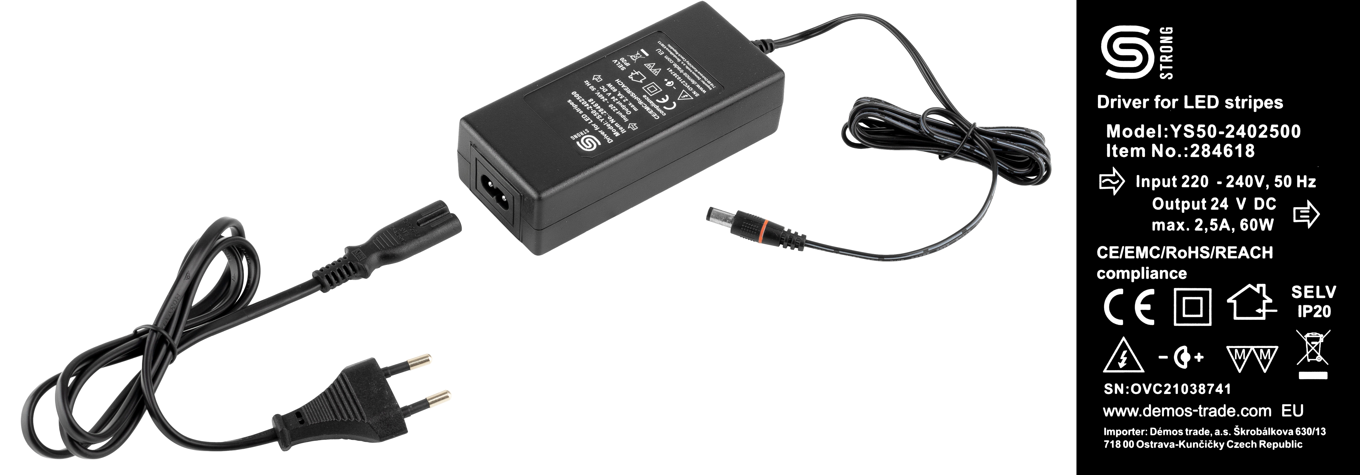 Transformateur pour éclairages LED et bandes LED avec une tension de 24V. Alternative possible - 284623 STRONG transformateur plat pour LED 24V 60W. Puissance max 60 Watts, courant max 2,5 A, tension d’alimentation 220-240V.