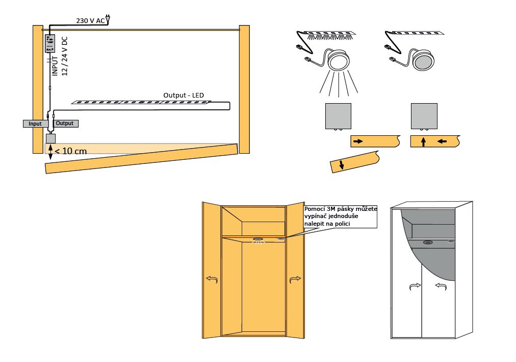 D'abord, coupez l'alimentation électrique du transformateur. Collez l'interrupteur a un endroit approprié, le plus pres possible de l'ouvrant de la porte, de sorte que lors de l'ouverture il ne gene pas les deux ergots et qu'il y ait un espace libre d'au moins 10 cm devant eux. Le câble marqué OUTPUT se connecte a la lumiere, au ruban led, etc. Le câble marqué INPUT se branche au transformateur / a l'armoire de distribution du transformateur. Ce n'est qu'ensuite qu'il faut connecter le transformateur a l'alimentation !