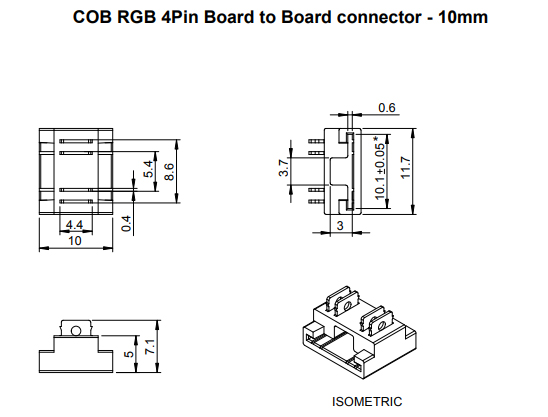 Connector for connecting CCT/RGB COB LED strip - cable (3-core cable/4-core cable). Suitable for LED strips of width 10mm - see Related assortment. The connector is placed onto the LED strip and the contact pins are pressed into the strip using pliers; the pins then latch-in into the strip to create the connection. The connector is therefore intended for single use. For use in profiles with a minimum width of 12mm and height 5,1mm.