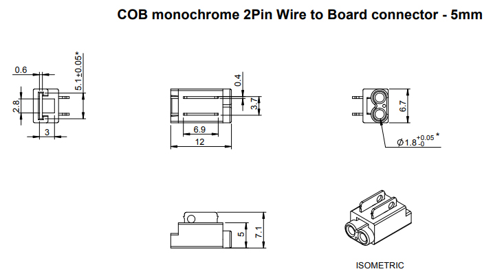 Connector for connecting COB LED strip - cable (2-core cable). Suitable for LED strips of width 5mm - see Related assortment. The connector is placed onto the LED strip and the contact pins are pressed into the strip using pliers; the pins then latch-in into the strip to create the connection. The connector is therefore intended for single use. For use in profiles with a minimum width of 7mm and height 5,1mm.