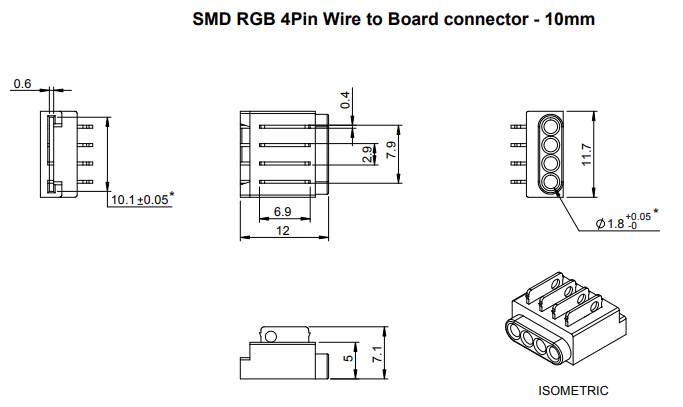 Connector for connecting RGB LED strip - cable (4-core cable). Suitable for LED strips of width 10mm - see Related assortment. The connector is placed onto the LED strip and the contact pins are pressed into the strip using pliers; the pins then latch-in into the strip to create the connection. The connector is therefore intended for single use. For use in profiles with a minimum width of 12mm and height 5,1mm.