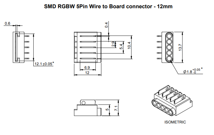 Connector for connecting RGBW LED strip - cable (5-core cable). Suitable for LED strips of width 12mm - see Related assortment. The connector is placed onto the LED strip and the contact pins are pressed into the strip using pliers; the pins then latch-in into the strip to create the connection. The connector is therefore intended for single use. For use in profiles with a minimum width of 14mm and height 5,1mm.