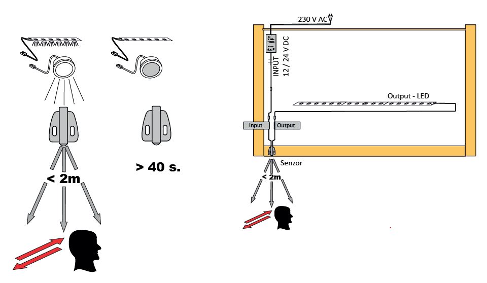 Coupez d’abord l’alimentation électrique du transformateur. Visser l’interrupteur a un endroit approprié, le plus proche possible de la porte, de sorte qu’en ouvrant, l’espace devant le capteur soit libre d’au moins 10 cm. Peut également etre utilisé derriere des portes vitrées translucides. Le câble marqué OUTPUT doit etre relié a la lumiere, au ruban led, etc. Le câble marqué INPUT doit etre connecté au transformateur / au boîtier du transformateur. Ensuite seulement, branchez le transformateur a l’alimentation !