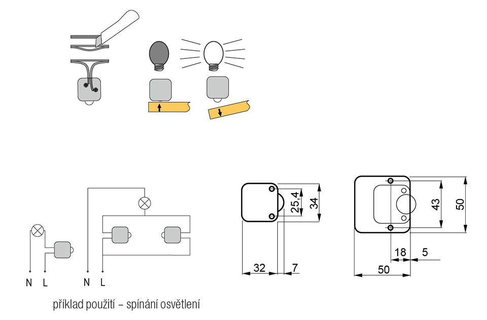 Interrupteur de porte mécanique pour mobilier. Coupe le courant a la fermeture de la porte. Tension max. 230V, courant max. 2A. Usage intérieur uniquement. Hauteur - 18mm, 15mm pour un carré de hauteur réduite. Certificat CE.