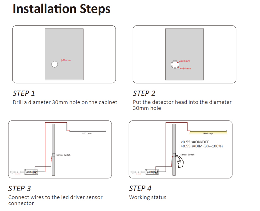 Coupez d’abord l’alimentation du transformateur. Insérez l’interrupteur dans un trou de diametre 18 mm et branchez le câble dans la prise correspondante du transformateur 3PIN. Ensuite seulement, connectez le transformateur a l’alimentation ! Attention, prévu uniquement pour une tension de 12 V ou 24 V DC (courant continu). Tension et puissance commutée (W) selon le transformateur utilisé. Couleur noire. .