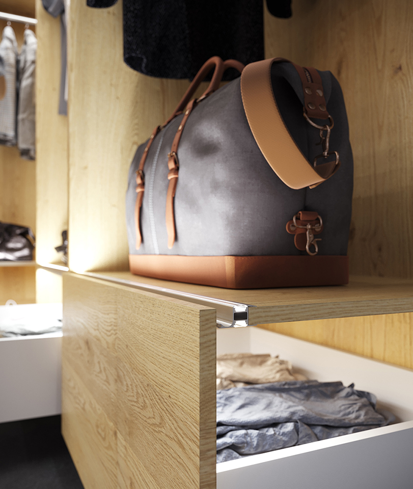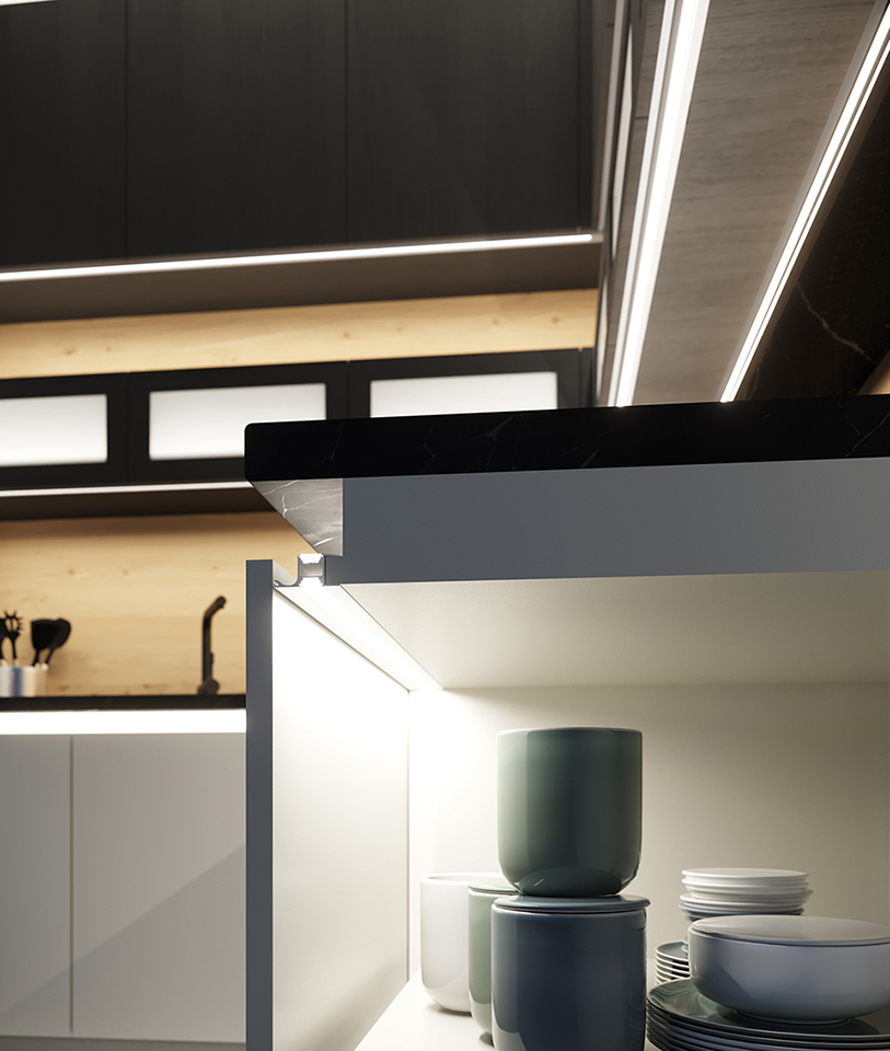 Profil a emboîter pour le chant avant du panneau. Possibilité de placer les rubans led vers le haut / vers le bas. Le chant avant du profil est équipé d’un butoir flexible. Le profil peut également servir pour les cuisines sans poignée. Moulures de recouvrement - 198517 TM-moulure de recouvrement a clipser translucide pour profils LED 2000mm et 221008 TM-moulure de recouvrement a clipser lactée pour profils LED 2000mm.