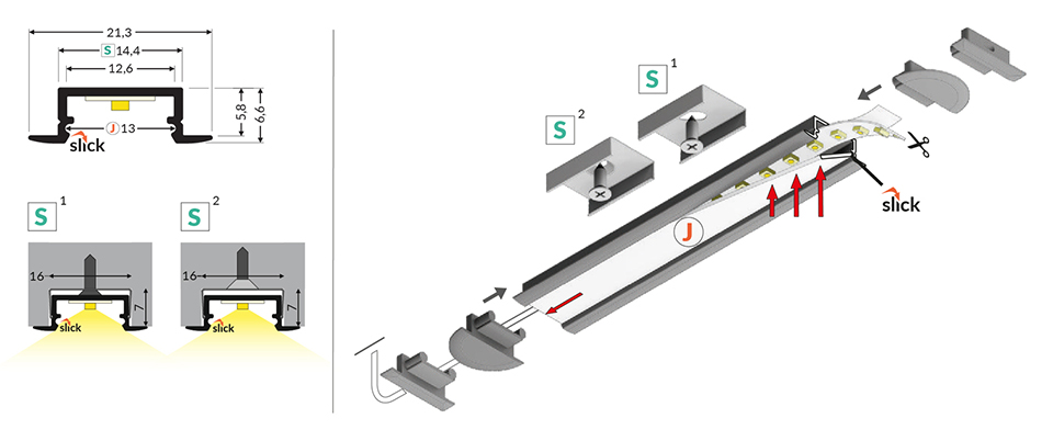 Des caches clipsables par le dessus sont disponibles pour ces profilés.