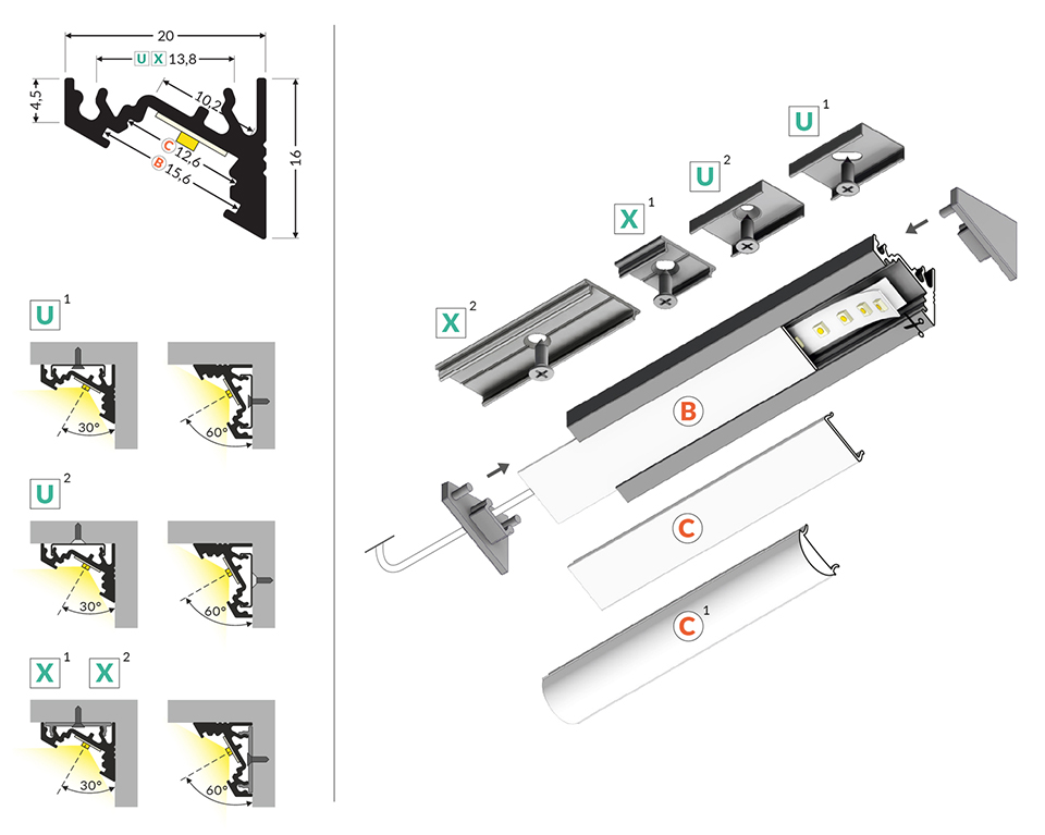 Profil en aluminium pour montage de surface dans un angle. Finition de surface - blanc RAL9003. En raison du vernissage, il est impossible d'utiliser dans ce profil les interrupteurs tactiles 215666, 215772 et 392223. Fixation par agrafes, collage ou a l'aide de vis a bois. Conçu pour des bandes LED d'une largeur maximale de 10 mm. Longueur 4050 mm. Moulures de couverture et embouts voir assortiment associé ci-dessous.