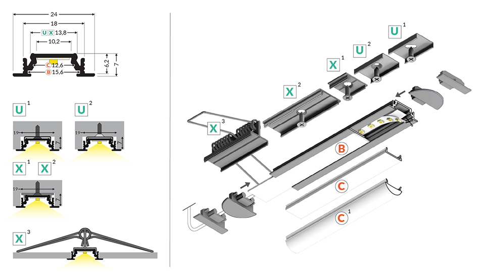 Profil en aluminium a encastrer. Dimensions : 3000 x 24 x 7 mm. Fraisage 18 x 6 mm. Finition - blanc RAL9003. Fixation avec agrafes, collage ou a l'aide de vis a bois. Conçu pour des bandes LED d'une largeur max. de 10 mm. Longueur 3000 mm. Moulures de finition et embouts voir assortiment associé ci-dessous. En raison du vernissage, il est impossible d'utiliser dans ce profil des interrupteurs tactiles et variateurs 215666, 215772 et 392223. Version a éclairage latéral voir Alternatives ci-dessous.