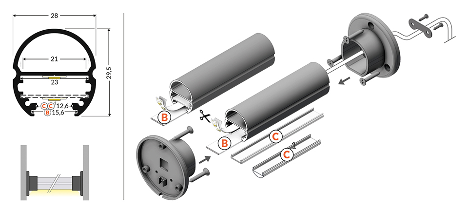 POUR ÉLARGIR LE FAISCEAU DU RUBAN LED, NOUS RECOMMANDONS D’UTILISER L’INSERT MÉTALLIQUE - 247572.. Profil pour bandes LED, pour réalisation de tringles de penderie éclairées.