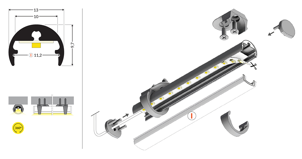 Profilé en aluminium rond pour bandes LED de largeur 8 mm (2,4 W, 4,8 W, 9,6 W). Convient par exemple pour l’éclairage des vitrines, l’avantage étant la possibilité d’orientation selon les besoins.