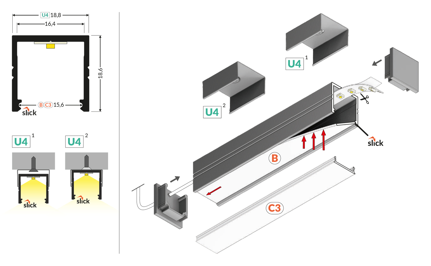 Profil LED pour montage en surface. Lors de l'utilisation de bandes LED avec au moins 120 LEDs/m et un couvercle diffusant, la lumiere se fond en une ligne continue. Fixation par collage ou vissage. Convient non seulement pour le mobilier, mais aussi pour un éclairage intérieur élégant. Bandes LED jusqu'a 16 mm de largeur. Cache-vis a emboîter (identique aux profils Surface, Groove, Corner...).