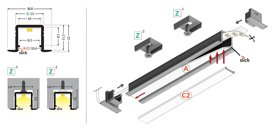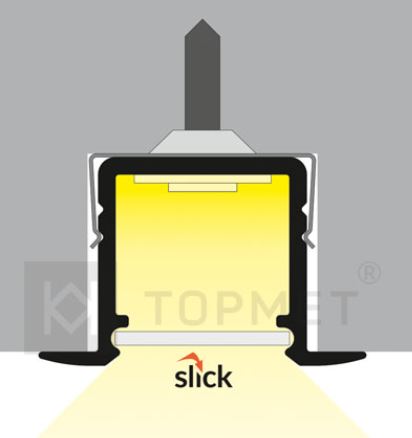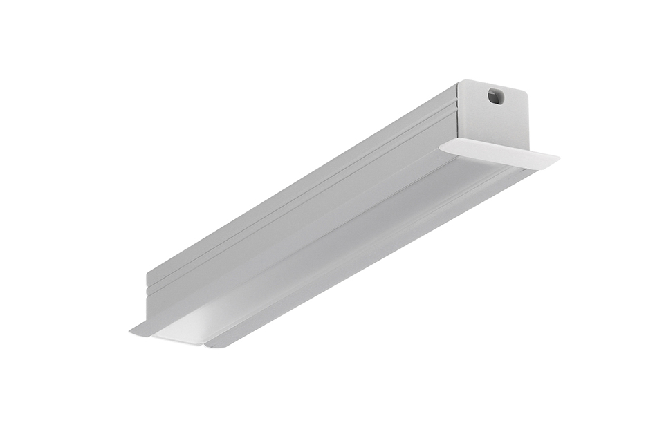 Profil LED a encastrer. Lors de l'utilisation de bandes LED avec un minimum de 120 diodes/m et un couvercle opaque, la lumiere se fond en une ligne continue. Convient non seulement pour les meubles, mais aussi pour un éclairage intérieur élégant. Bandes LED jusqu'a une largeur de 10 mm. Cache-vis clipsable (identique aux profils Slim).