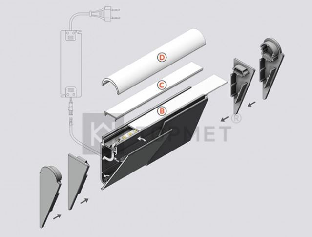 Caches emboîtables, clipsables identiques aux profils Groove, Surface, Corner, demi-ronds identiques au profil UNI