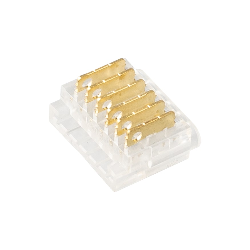 Spojka pro spojení RGBCCT LED pásek - kabel (šestilinka). Vhodné pro LED pásky šířky 12mm viz. související sortiment. Spojka se na LED pásek nasadí a pomocí kleští se přitlačí kontaktní trny do LED pásku, kdy se trny poté do LED pásku zaříznou. Spojka je tedy určena pro jedno použití. Pro použití v profilech o min. šířce 14mm a výšce 5,1mm.