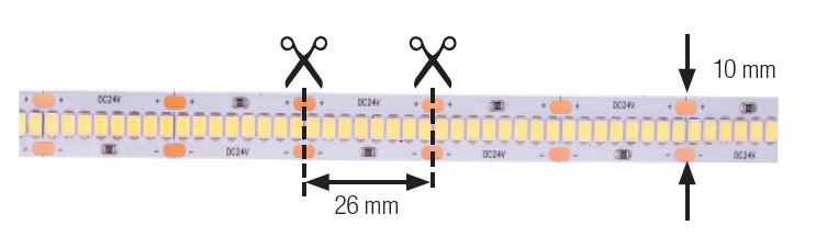 Lors de la prise de rubans LED plus courts, couper au point de découpe le plus proche en dessous. La tolérance est d’environ 1 cm par metre de longueur.