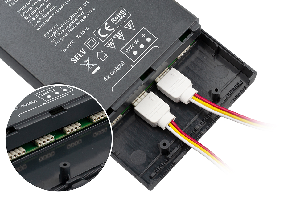 Le colis contient toujours 2 pcs de câbles de connexion de 2 m (connecteur pour connexion a l’unité All in One d’un côté, raccord pour connexion du ruban LED sans soudure de l’autre côté). Apres raccordement des rubans LED a l’unité, il est nécessaire de fixer le couvercle des câbles a l’aide des vis a bois fournies, sinon des coupures de contact non souhaitées peuvent survenir. D’autres câbles peuvent etre achetés séparément :