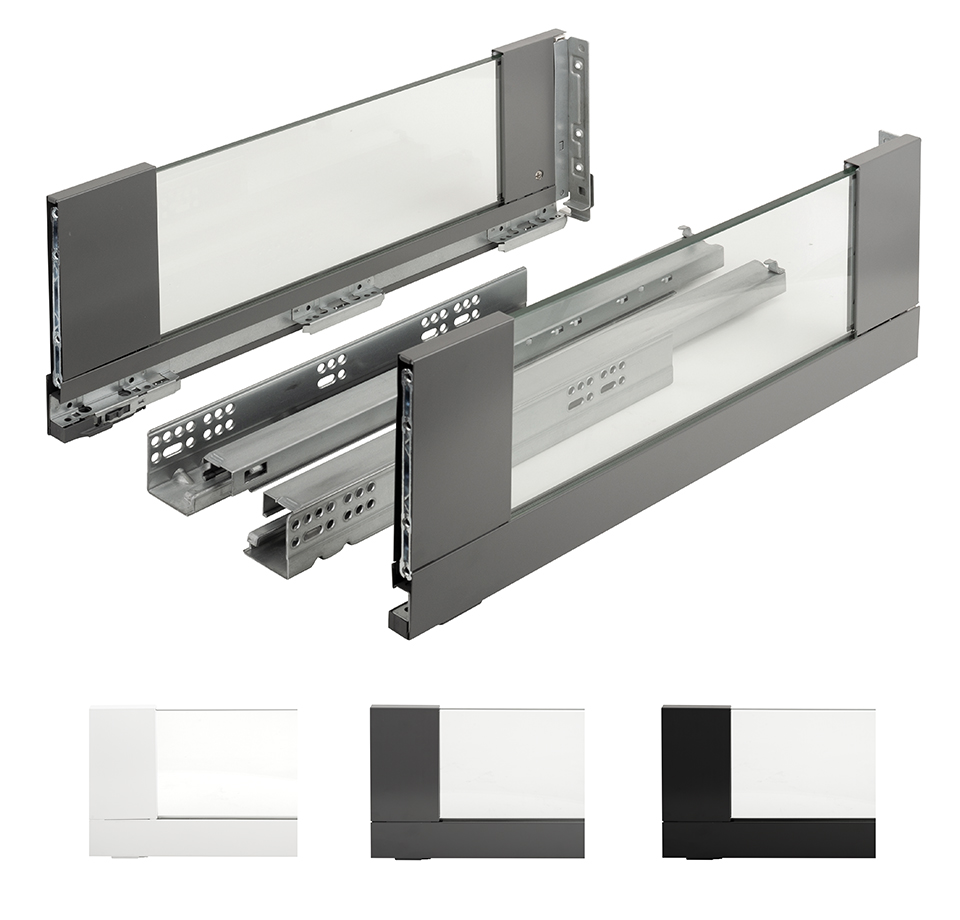 Ensemble complet pour la fabrication de tiroir avec côté creux étroit (13mm) et tiroirs coulissants a amortissement et synchronisation intérieure. Capacité de charge jusqu'a 40kg. Durée de vie des coulisses d’au moins 50 000 cycles. Réglage du panneau avant vers le haut/bas et droite/gauche. Possibilité de réglage de l'inclinaison du tiroir complet a l'arriere du côté (sert a régler l'inclinaison du panneau avant). Pour la fabrication du fond et de l’arriere, il est nécessaire d’utiliser un matériau d’épaisseur 16mm.