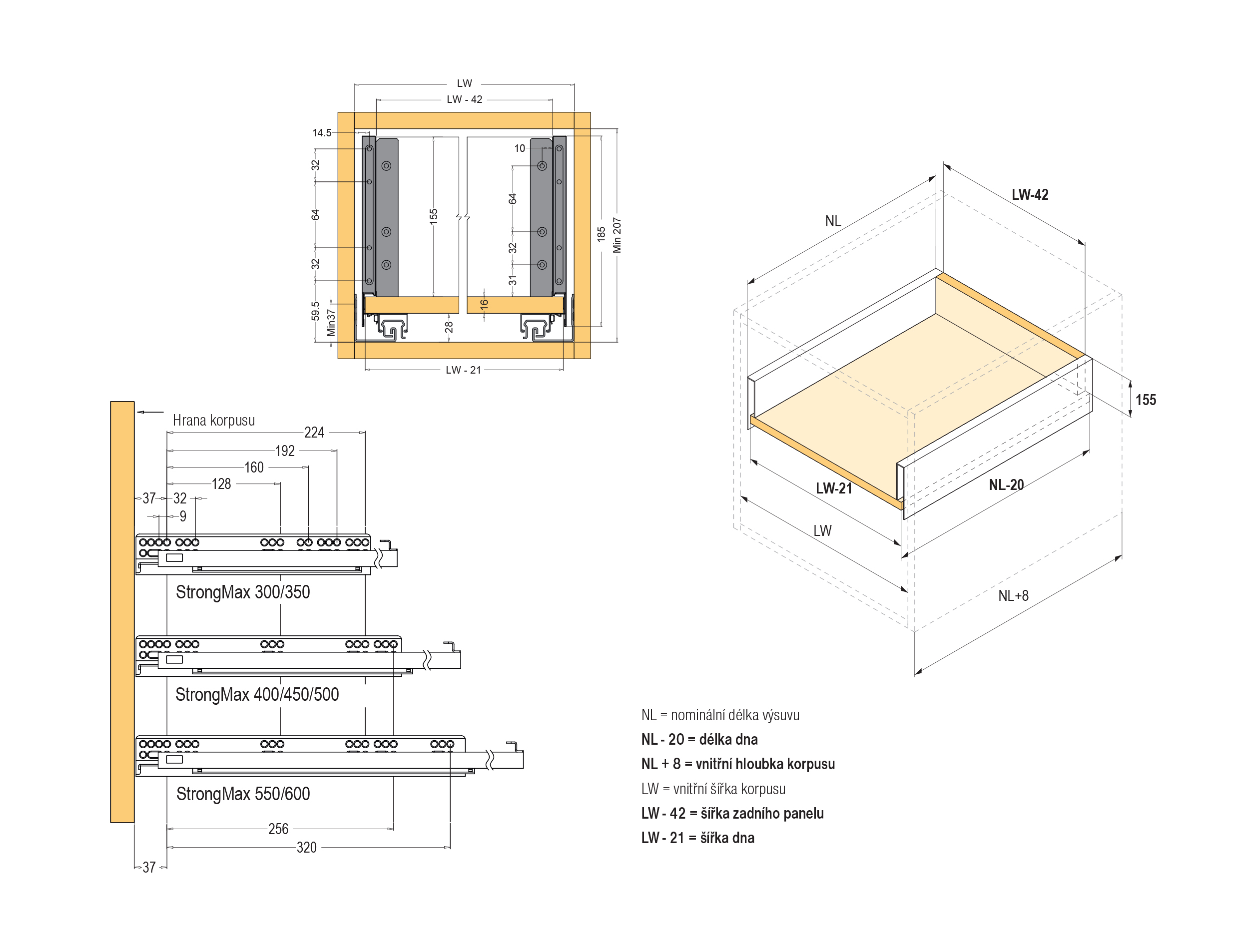 Alternativement, il est possible d'utiliser le systeme box StrongMax 18, ou le matériau d’épaisseur 18mm est utilisé pour la fabrication du fond et de l’arriere. Les accessoires pour tiroirs intérieurs sont communs aux deux systemes. Pour les tiroirs avec côté de hauteur 249mm, il n’est pas possible de fabriquer un panneau avant du tiroir intérieur, il est possible de le remplacer par un panneau classique et de décaler le tiroir complet vers l’intérieur du corps d’environ 20mm.
