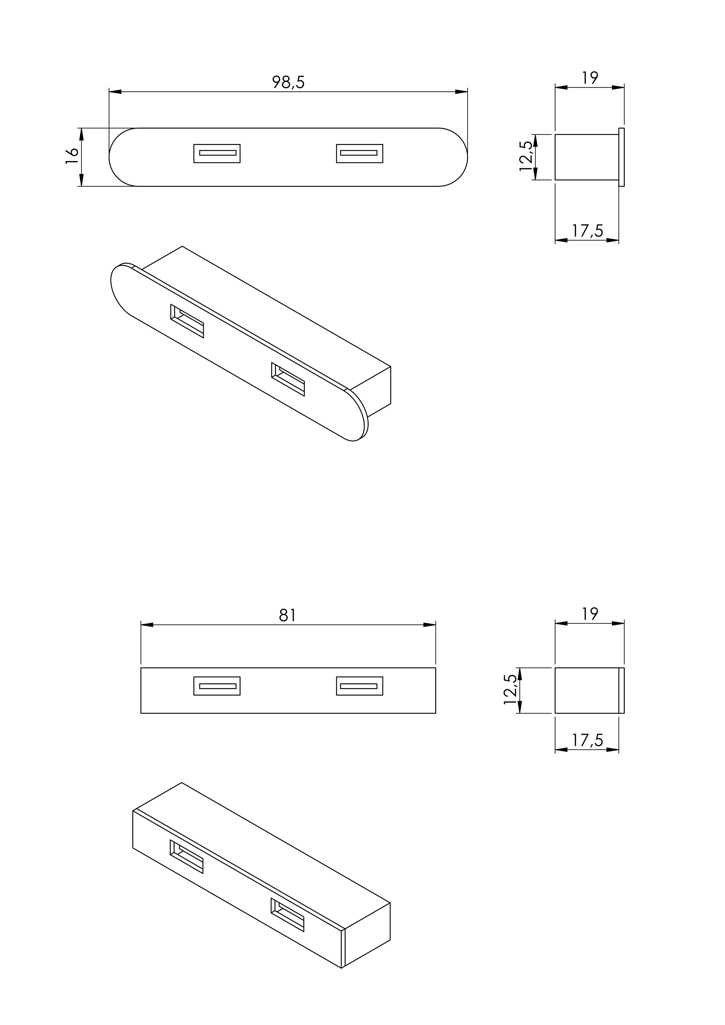 version affleurante : 81,5 mm x 12,8 mm x profondeur 19 mm