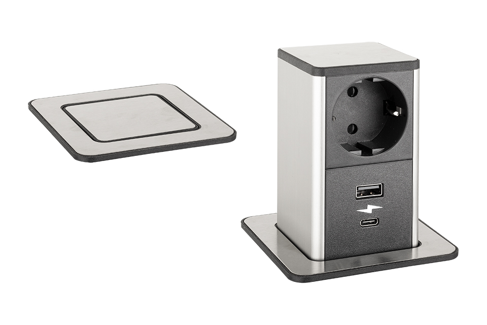 StrongPower PowerUp tiroir, 1x230V, Schuko, USB A+C, inox