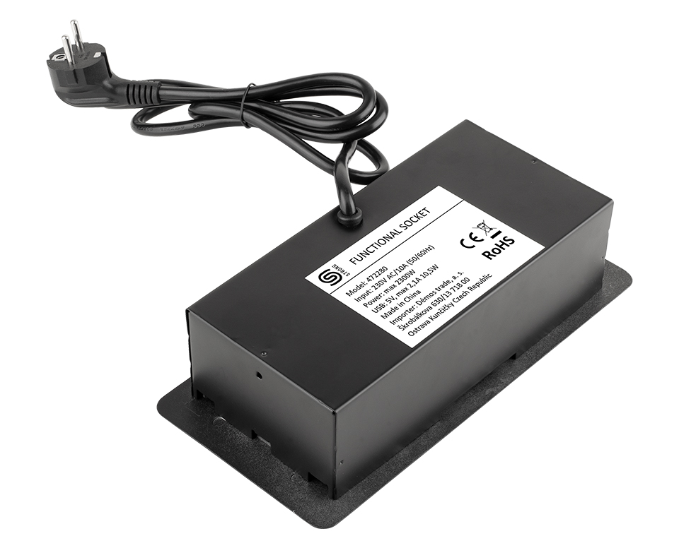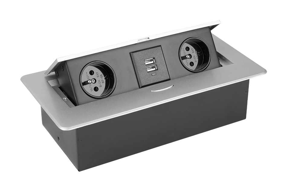 Strong prise électrique 2x 230V, 2x USB Power fast charger Type français (standard pour CZ, SK, PL, etc.), câble 1,5m, dimensions 263x130x67mm, argenté