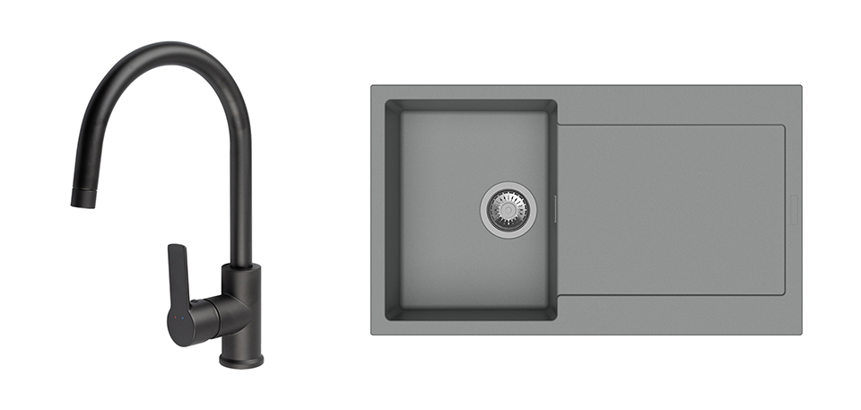 StrongSinks évier granit Zala 860x500 gris + robinet Loira noir mat
