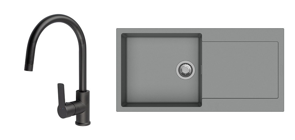 StrongSinks S3 évier granit Zala 1000 gris + robinet Loira arc noir mat