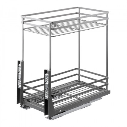 Double panier inférieur pour une largeur extérieure de corps de 300 mm. Dimensions : largeur 260, profondeur 455, hauteur 490 mm. Finition gris foncé. Coulisse a sortie totale Strong avec amortissement a la fermeture.