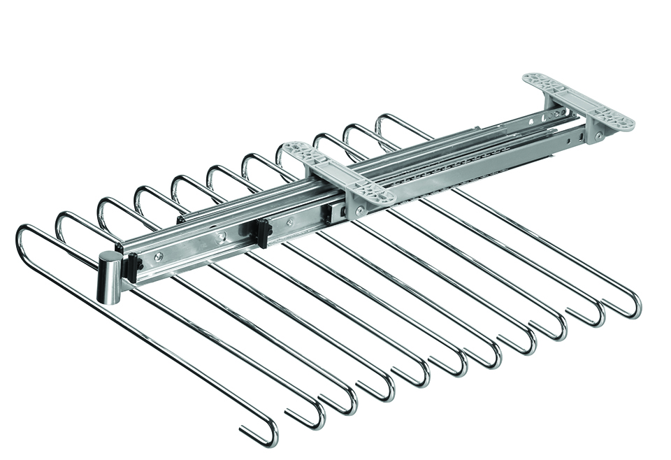 Porte-pantalons et porte-jupes coulissant. Dimensions : largeur 375, profondeur 470, hauteur 93 mm. Finition chrome. 11 nervures