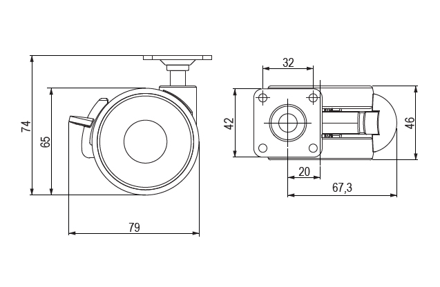 TENTE roue Linea 65mm avec frein 70kg gris foncé
