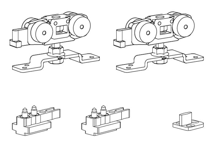 Ensemble de ferrures pour 1 vantail (largeur min. 600mm). Contient 2x frein, 2x chariot, 1 guide. Le guidage supérieur et les supports muraux doivent etre commandés séparément, cf. assortiment connexe ci-dessous.