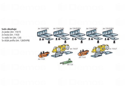 Quincaillerie pour porte intérieure coulissante jusqu'a 160kg, y compris 6 pcs de supports de profil. Profil de guidage approprié = DT305-7 (2-3-6m). Roulements.