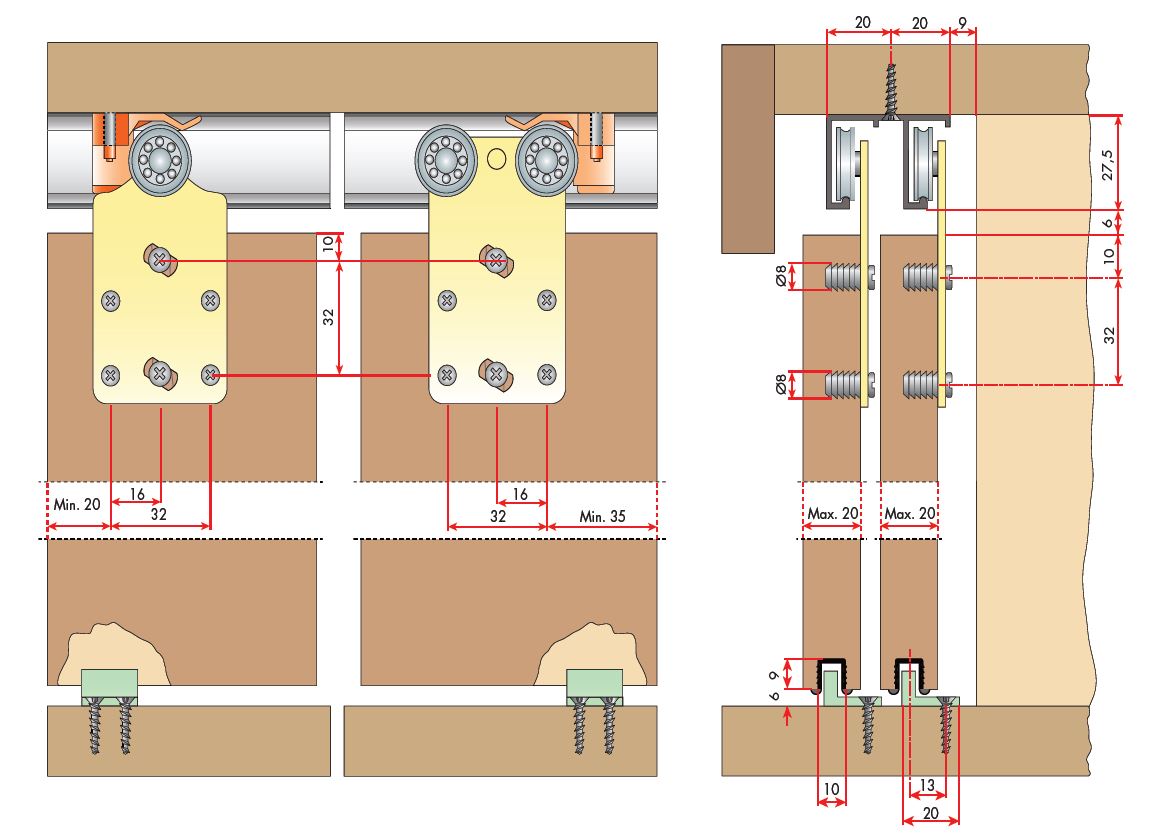 Ensemble de ferrures pour un vantail, incluant l'axe de guidage. Charge maximale 30 kg. Épaisseur DTD max. 20 mm. Profil supérieur simple : DT364 - DT366. Profil supérieur double : DT367 - DT369. Profil inférieur en plastique a encastrer : DT370.