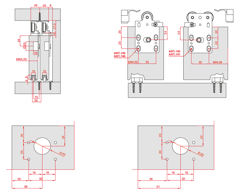Ensemble de ferrures avec roulement pour porte coulissante encastrée avec guidage supérieur d'un poids maximal de 50 kg.