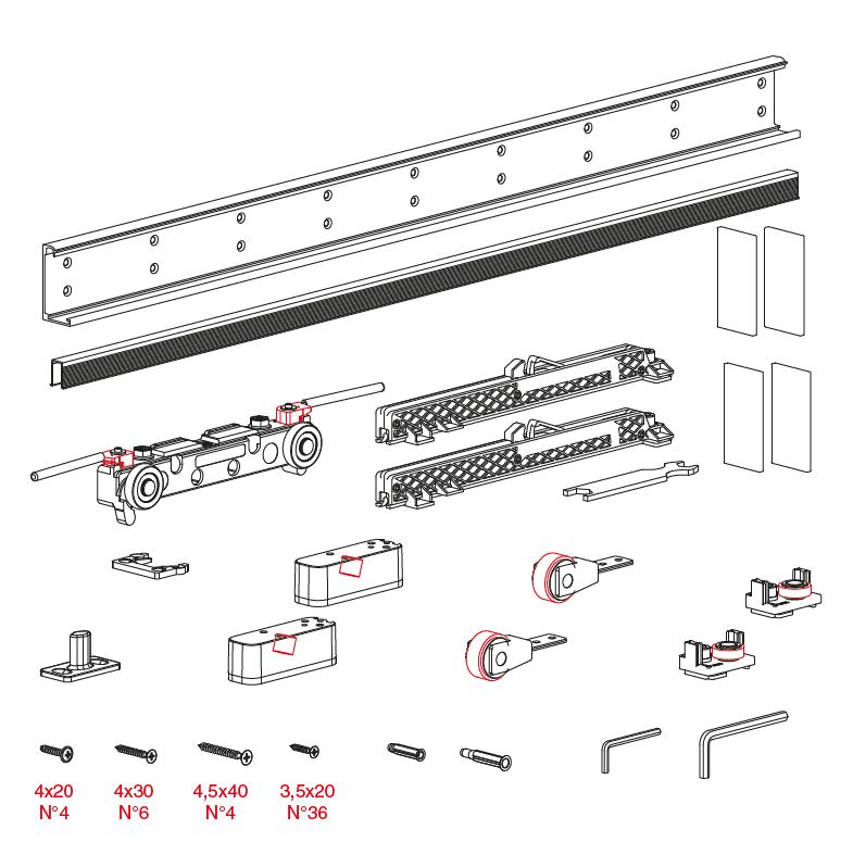 Pour la mise en place de l’ouvrant, un espace d’au moins 30 mm en hauteur doit etre disponible. Magic2 - nouveautés par rapport a la version originale : • prolongation de la course amortie de 20 mm a 50 mm, • amortisseurs réglables, • meilleure protection des portes contre tout contact avec le mur, • réglage horizontal et vertical micrométrique possible sans retirer la porte du rail de guidage, • amélioration de la protection contre la chute des portes hors du profil de guidage, • roulettes inférieures plus grandes, avec un diametre et des roulements supérieurs. Épaisseur du caoutchouc doublée, • fonctionnement plus silencieux, • largeur de porte 680 – 1800 mm, • possibilité de montage sans caches latéraux du profil de guidage. Ensemble de chariots de rechange pour version ancienne des ferrures - 422052 TERNO Magic ensemble de chariots inférieurs pour ancienne version des ferrures Magic.