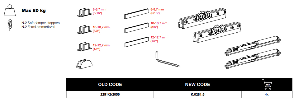 Ensemble de ferrures pour portes en verre. Épaisseur du verre 8 - 12,7 mm. Capacité de charge 80 kg, 2x amortisseur hydraulique, fermeture lente 70 mm