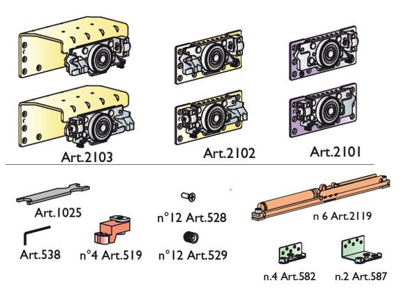 Ensemble de ferrures pour 3 vantaux incluant des amortisseurs a air (6 pcs). Épaisseur du stratifié max. 22 mm. Poids du vantail 40 - 80 kg. Largeur min. du vantail - 650 mm. Veuillez noter que pour ce type de quincaillerie, le vantail est suspendu en dehors du centre de gravité et une flexion du vantail peut se produire (applicable généralement aux systemes overlay). Pour équilibrer la tension, utilisez les renforts 88040 - a raccourcir et DT157 - au-dessus d'une hauteur de 2,3 m - version plus rigide pour une charge plus élevée (cat.2014 p. 5.80).