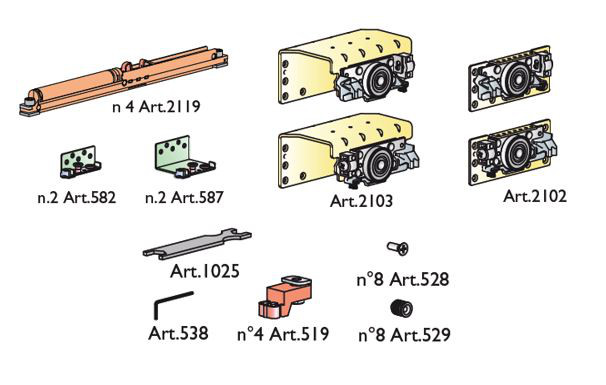 Ensemble de ferrures pour 2 vantaux y compris amortisseurs pneumatiques (4 pcs). Épaisseur du stratifié max. 22 mm. Pour un poids de vantail de 40 a 80 kg. Largeur minimale du vantail - 600 mm. Nous attirons l’attention sur le fait que pour ce type de quincaillerie, le vantail est suspendu en dehors du centre de gravité, ce qui peut entraîner un affaissement du vantail (c’est une regle générale pour les systemes a montage apparent). Pour compenser les tensions, utiliser les renforcements 88040 - coupable, et DT157 - au-dela de 2,3 m de hauteur - version plus rigide pour sollicitations plus fortes (cat.2014 p. 5.80).