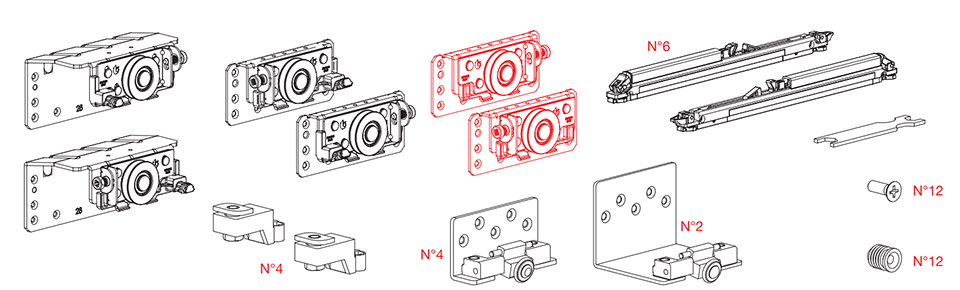 Ensemble de ferrures pour 3 vantaux, comprenant des amortisseurs hydrauliques (6 pcs). Épaisseur du panneau mélaminé max. 28 mm. Pour poids du vantail max. 80 kg. Largeur min. du vantail - 750 mm. Veuillez noter que pour ce type de quincaillerie, le vantail est suspendu en dehors du centre de gravité, ce qui peut entraîner une flexion du vantail (ceci s'applique généralement aux systemes montés en applique). Pour compenser les contraintes, des renforts de porte sont disponibles, voir gamme associée.