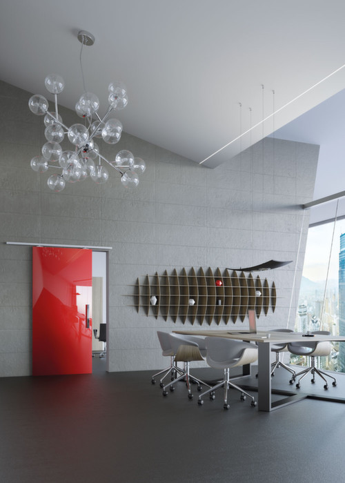 Ensemble de ferrures pour un vantail avec systeme d'amortissement a la fermeture. Roulettes a roulement a billes. Capacité de charge des portes - max. 160 kg. L'ensemble comprend la quincaillerie pour 1 vantail sans supports muraux. Largeur minimale du vantail 865 mm. Montage et démontage faciles. Les supports du chariot peuvent etre fraisés, ce qui réduit l'écart entre la porte et le rail supérieur jusqu'a 11 mm.